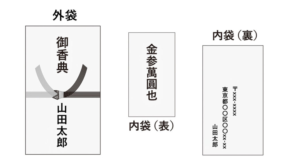 内袋の表面には香典の金額を、裏面には差出人の住所と氏名を書きます。